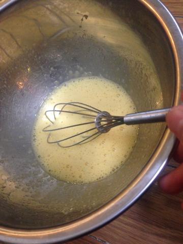 4.別で、ボウルに卵を溶き入れて、グラニュー糖を入れます。ホイッパーで白っぽくなるまで混ぜます。