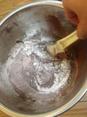 5.4に3を加えます。粉類 (小麦粉、ココアパウダー)も入れて滑らかになるまで混ぜます。