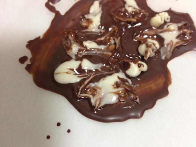 9.ここからデコレーション。飾り用のチョコを作ります。付属のチョコを少量残しておいてこれを湯煎で溶かします。溶かしたチョコをオーブンシートの上に薄くのばし、この上に付属のペンチョコ(ホワイト)を適量たらします。フォークや竹串で軽くまぜて、マーブル模様を作ります。固まったら手で好みの大きさに割り、ケーキの上にトッピングします。