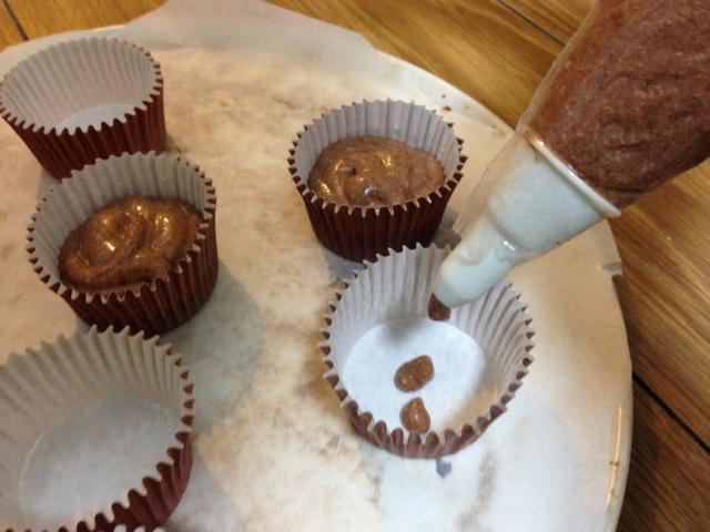 2. 1の生地を付属の焼き型に入れます(紙製)スプーンで入れろと書いてありますが、それだと大変そうなので自前の絞り袋に入れて型にしぼっています。