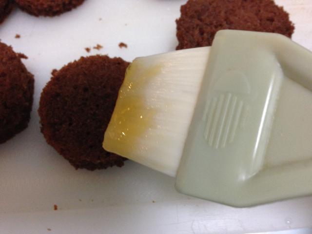 6.5でスライスしたケーキの上面にシロップと付属のアプリコットソースを刷毛で塗ります。